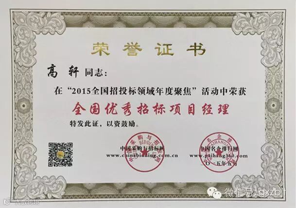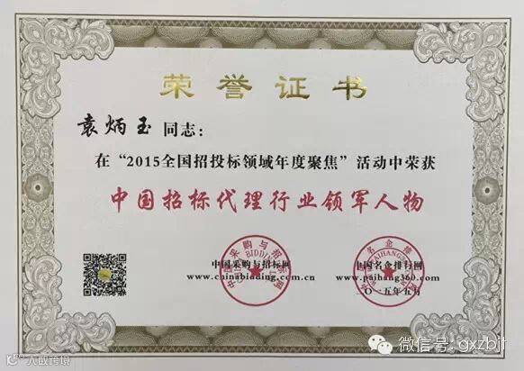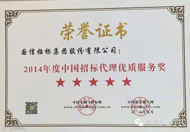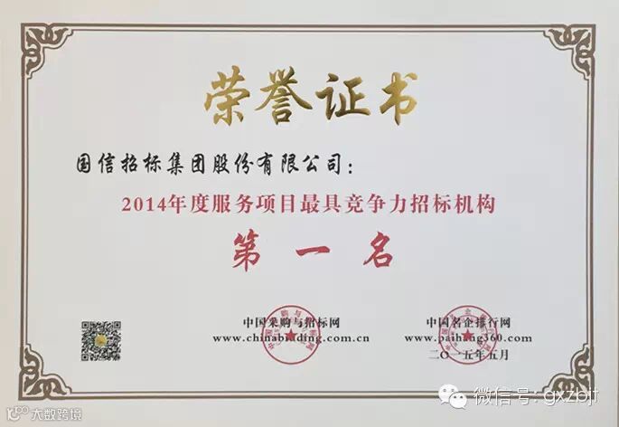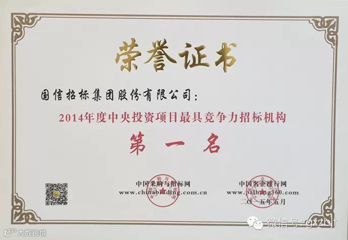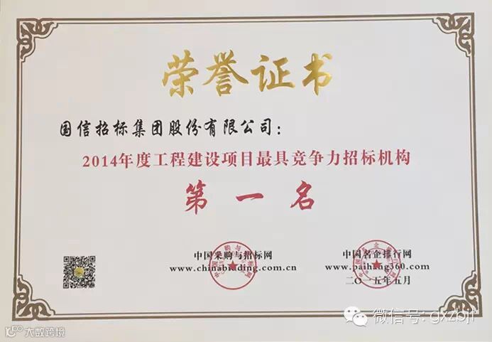 日前,2015(第九届)全国招投标领域年度聚焦暨中国最具竞争力招标机构品牌评价系列榜单在京正式揭晓,国信招标集团股份有限公司荣膺2014年度“中国最具竞争力招标机构百强第一名”、“中国招标机构十大顶级品牌”、“中国阳光招标奖”、“中国招标代理五星级优质服务奖”、“工程建设项目最具竞争力招标机构第一名”、“中央投资项目最具竞争力招标机构第一名”、“服务项目最具竞争力招标机构第一名”,集团总裁袁炳玉荣膺“中国招标代理行业领军人物”,集团业务十部总经理高轩荣膺“全国优秀招标项目经理”。