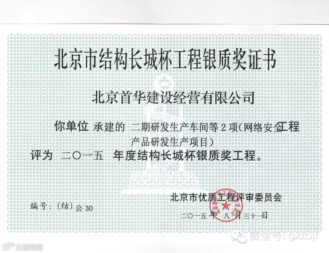 2015年8月31日,由北京首华建设经营有限公司承建、北京国信建业工程管理有限公司监理的欧瑞德二期研发生产车间等2项项目(网络安全产品研发生产项目)荣获北京市结构长城杯工程银质奖。此奖项一年一度,主办方北京市优质工程评审委员会以“体现先进性、适用性和可操作性”为原则,结合长城杯工程评审工作的实际情况,与新的规程、规范、 标准相协调,派相关专家对工程的现场及报送的资料进行审查。本项目经过层层筛选、严格评审,最终荣获银质奖。
