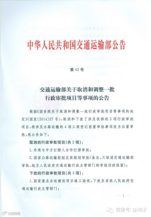 导读: 交通运输部关于取消和调整一批行政审批项目等事项的公告