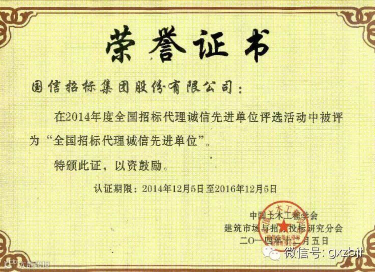 近日,在中国土木工程学会建筑市场与招投标研究分会(以下称“分会”)开展的“全国招标代理诚信先进单位表彰活动”中,国信招标集团股份有限公司经过“分会”专家的严格评审,在众多的候选名单中脱颖而出,并被授予“2014年度全国招标代理诚信先进单位”称号。