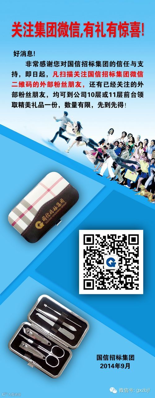 非常感谢您对国信招标集团的信任与支持。即日起,凡扫描关注国信招标集团微信二维码的外部粉丝朋友,或已经关注微信的外部粉丝朋友,均可到公司10层或11层前台领取精美礼品一份,数量有限,先到先得!