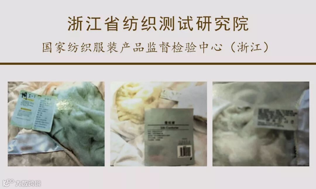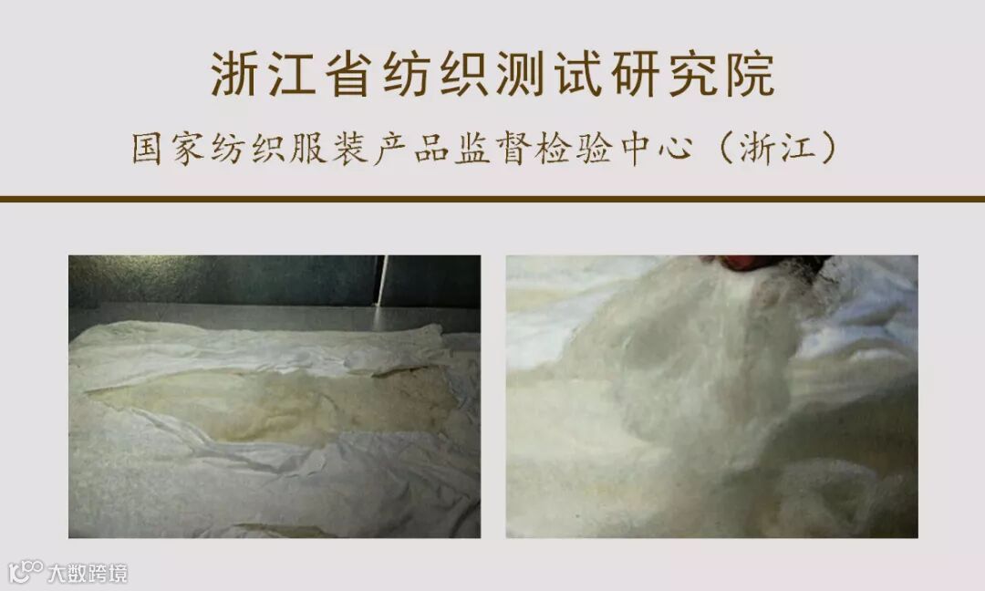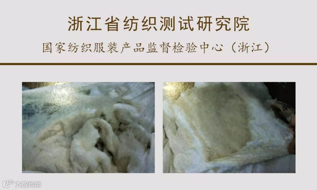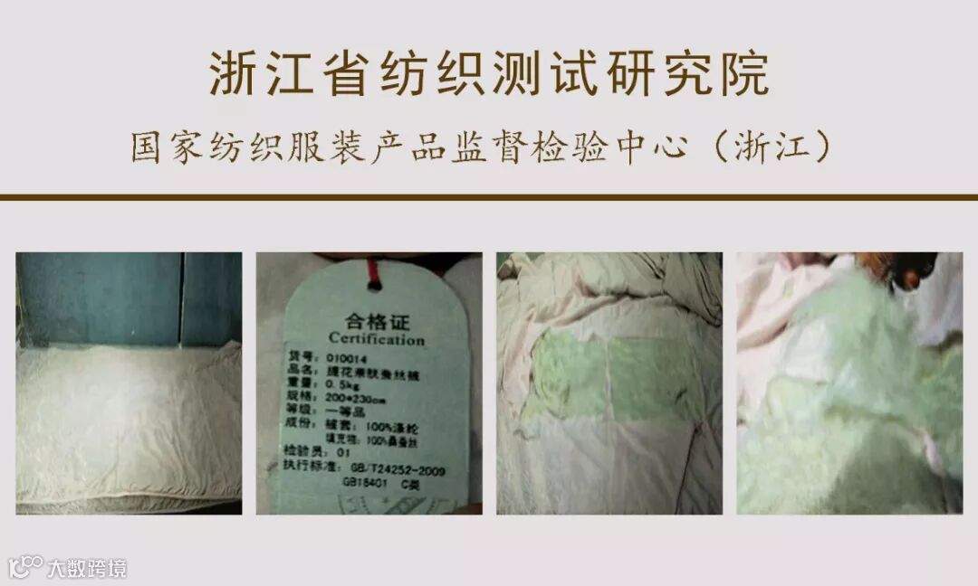 实际:填充物含量为桑蚕丝(短丝绵),100%含微量其它纤维(棉、聚酯纤维等);一等品标准要求蚕丝必须是长丝绵或中长丝绵,短丝绵的蚕丝被只能为合格品;含杂量为0.7%,远远高于一等品0.2%的标准要求和合格品0.5%的标准要求。