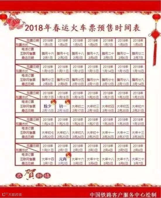 2018年1月18日可以通过网络购买2018年春节当天(2月16日)的火车票。