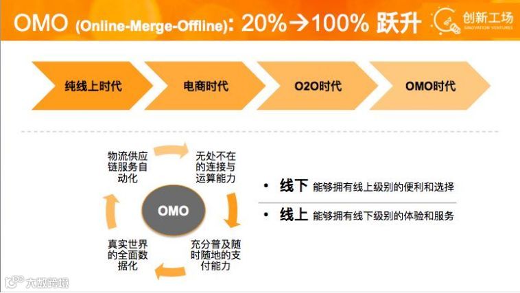 第四个阶段是摩拜在发展的过程中,诞生的一个全新的世界,一辆自行车扔在外面,不用做任何事,大量的用户就来了。线上流量越来越贵,但线下流量仍然有巨大的价值洼地。线上赋能线下的新场景机会涌现,这就是OMO的雏形。