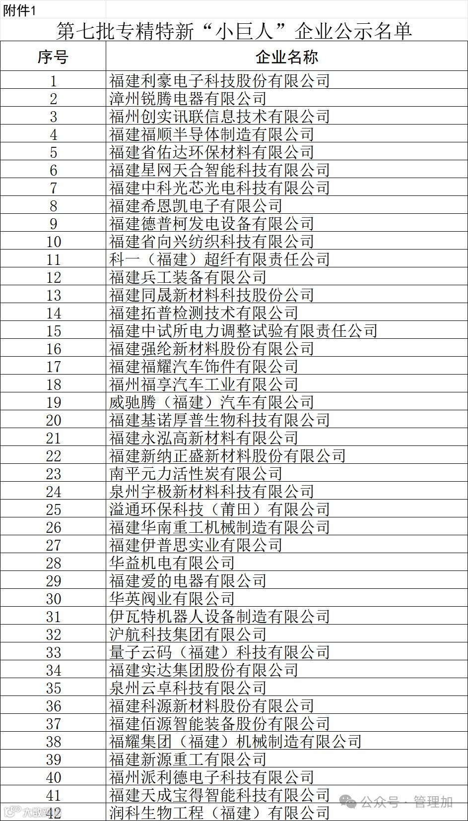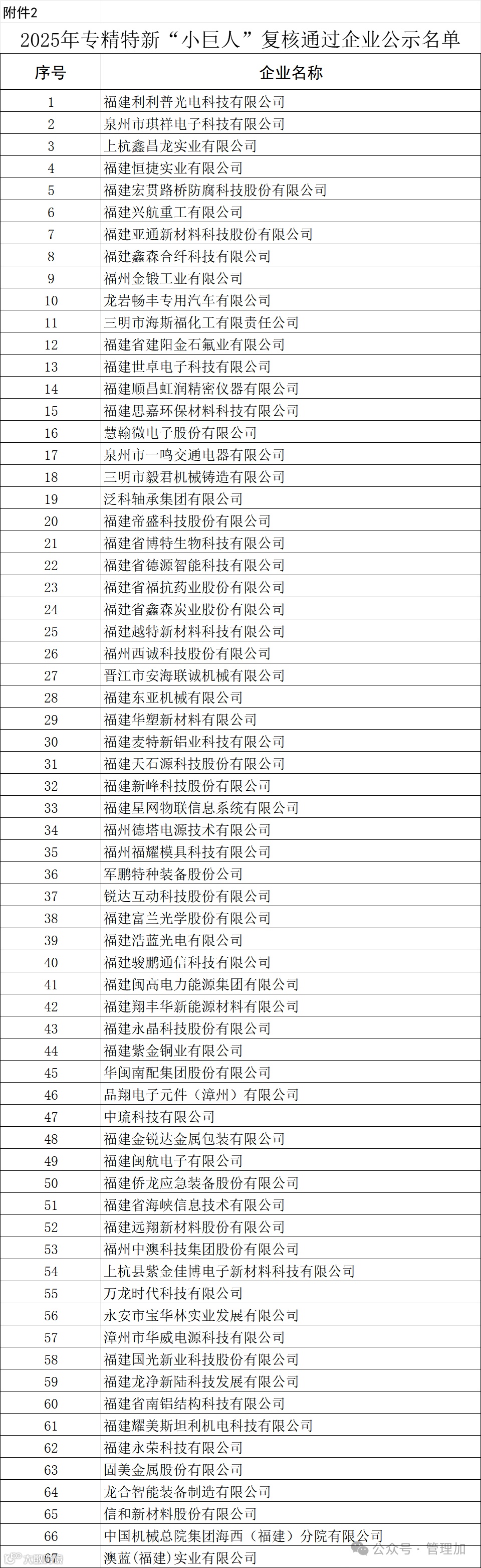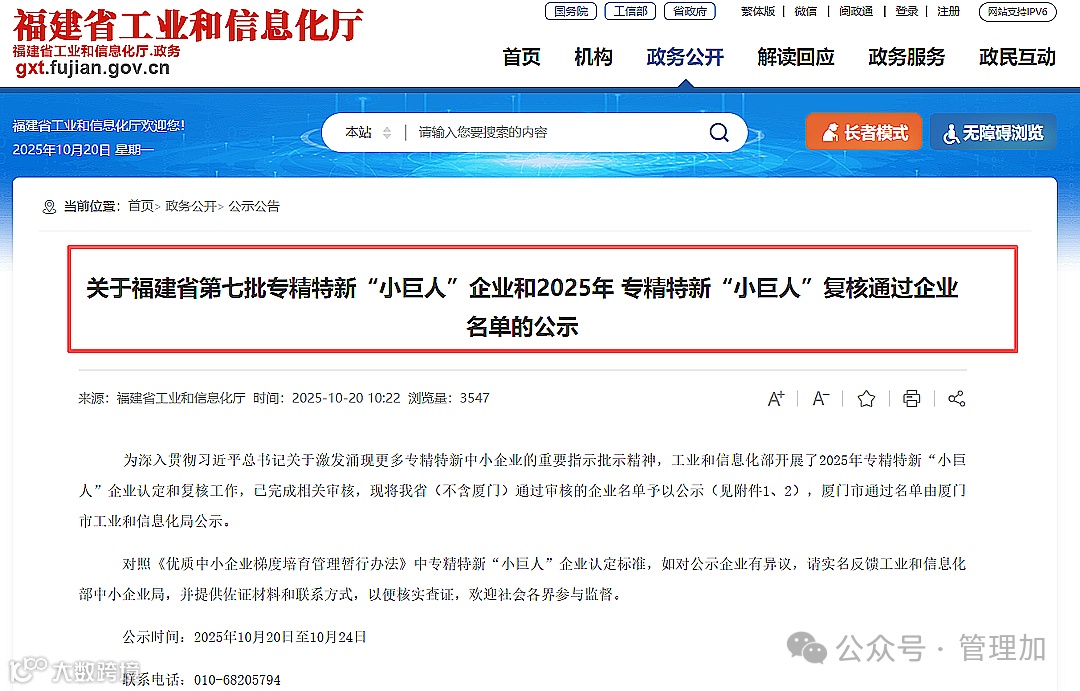 2025 年 10 月 20 日,福建省工业和信息化厅正式公示第七批专精特新 “小巨人” 企业及 2025 年复核通过企业名单。