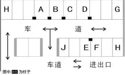 在选择位置时候,有时候会在墙面之间形成车位,如图例的G、H。这样的位置,无论是正着进去还是倒着进去,都要比其他车位多倒几把,非常不方便,而且,如果出来要经常倒车,很可能把车撞了。同时,墙面也会使得开门不方便。