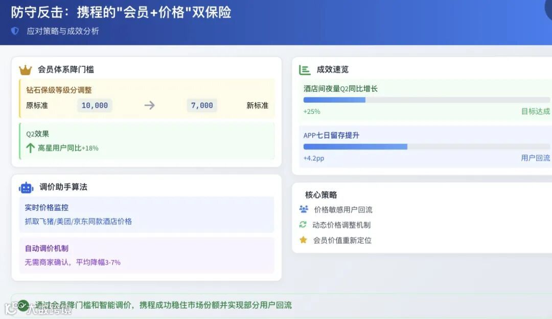 面对激烈的竞争,携程也采取了一些积极的应对策略。在会员体系方面,降低钻石会员升保级门槛,等级分从10000调整为7000 ,旨在吸引更多用户成为高级会员,提高用户粘性和忠诚度。在价格管控上,推出“调价助手”,通过算法全网比价,若合作酒店定价高于其他平台,自动调低价格,无需商家同意,以此维持价格竞争力,保证在酒店预订业务上的优势。