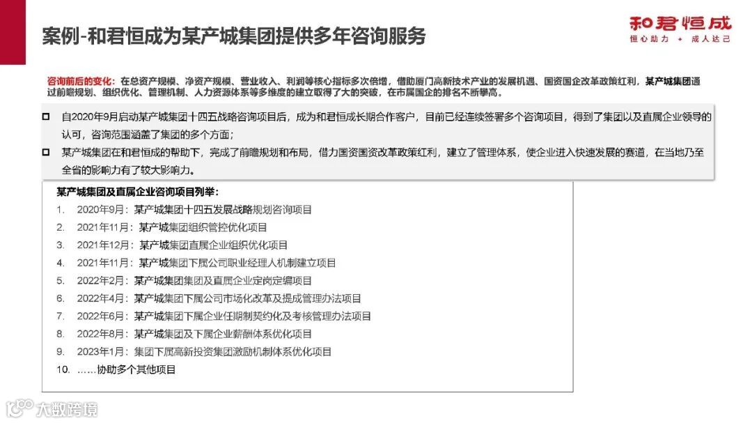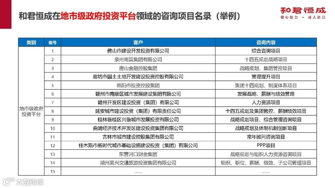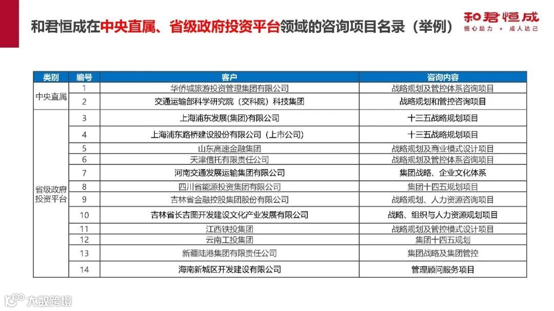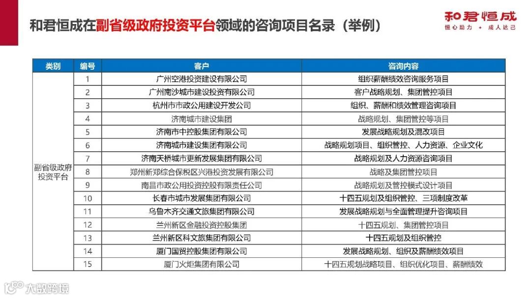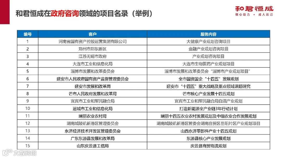 此外,和君恒成在政府咨询领域,为河南、江苏、大连等多地政府及部门提供产业规划等项目;在中央直属、省级、副省级、地市级政府投资平台领域,也为众多企业提供了战略规划、组织管控、人力资源等多方面咨询服务。