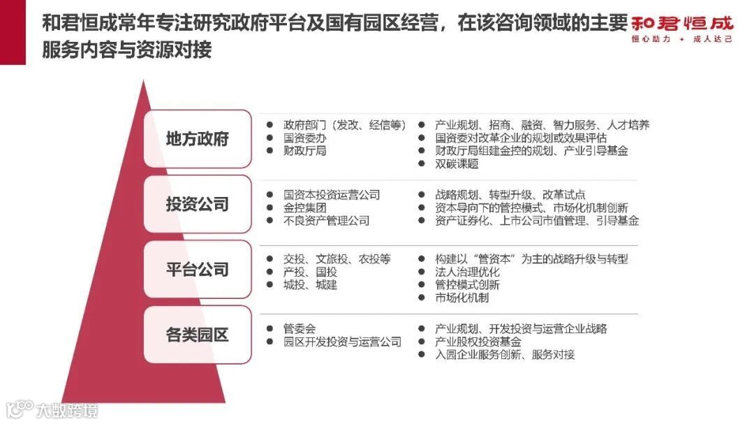 北京和君恒成企业顾问集团股份有限公司,常年专注政府平台及国有园区经营领域咨询服务,业务范围广泛,服务成效显著。服务对象涵盖多类主体,包括地方政府及相关部门(如发改、经信、国资委办、财政厅局等)、各类国企集团(国资本投资运营公司、金控集团、交投、文旅投等)、园区及相关公司(管委会、园区开发投资与运营公司等)。
