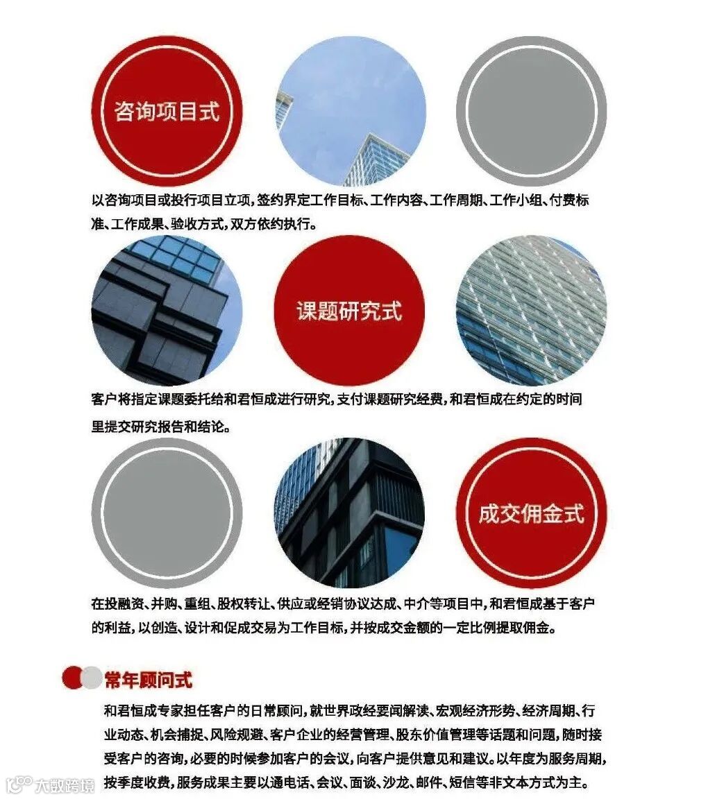 常年顾问式:咨询公司专家作为客户的日常顾问,提供宏观经济、行业动态等咨询服务,以年度为周期,按季度收费。