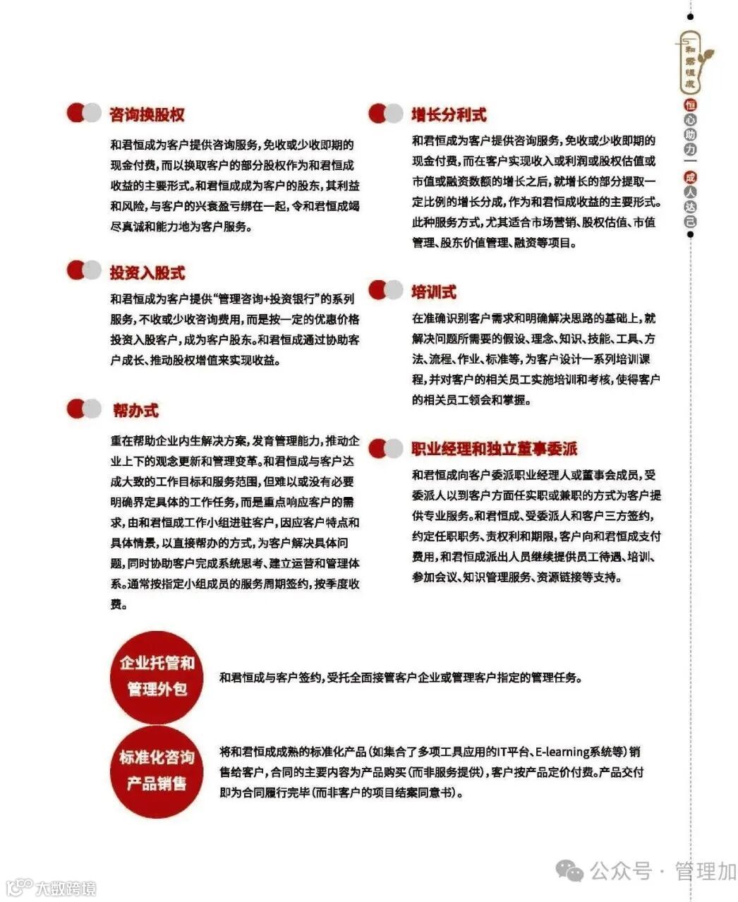 投资入股式:咨询公司提供“管理咨询+投资银行”服务,按优惠价格投资入股客户,通过协助客户成长实现收益。