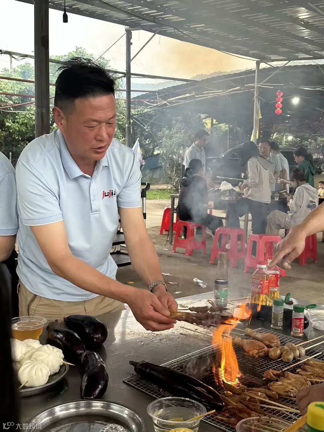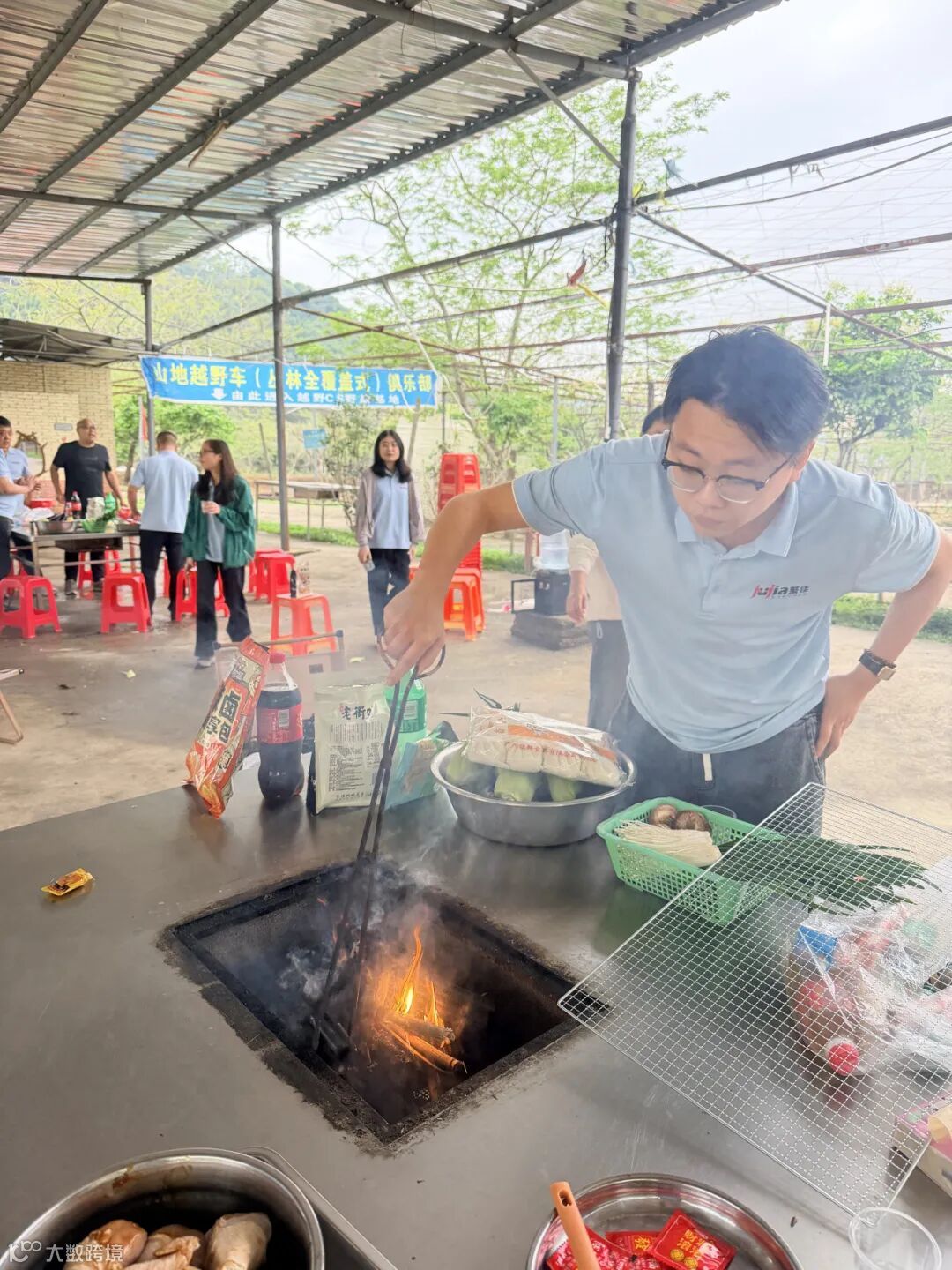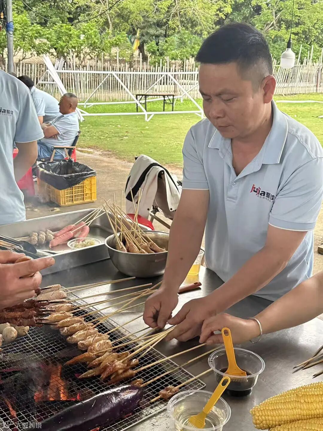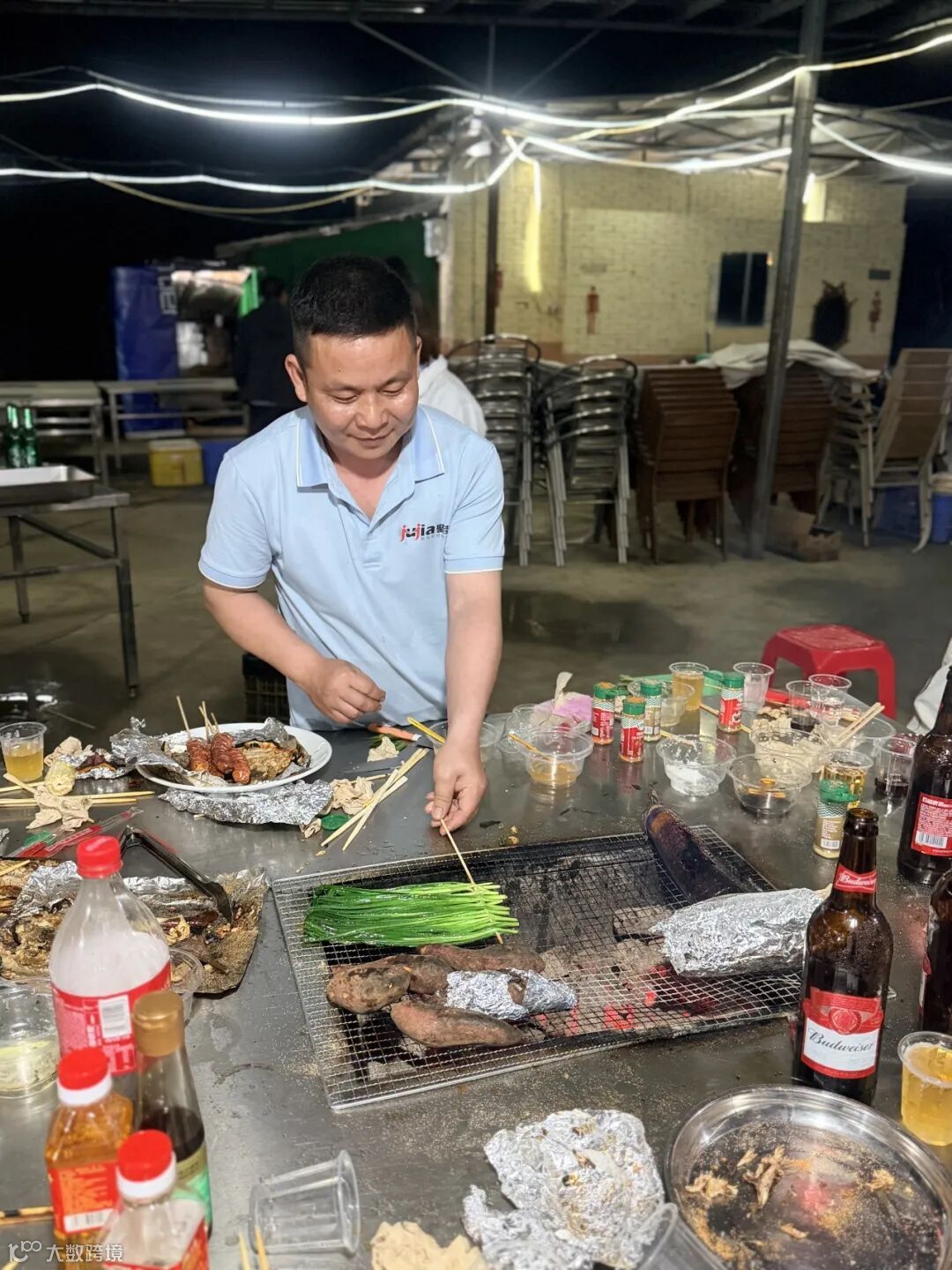 大家分工明确、各司其职,化身“烧烤达人”:有人负责生火烤肉,熟练地翻转着串儿,刷上秘制酱料,焦香四溢的香气瞬间弥漫全场;有人负责串制食材,有条不紊地搭配荤素,让每一串都分量十足、口感绝佳;还有人围坐在炭火旁,一边等待美食,一边畅谈生活与工作,分享日常趣事,偶尔调侃打趣,欢声笑语回荡在夜空。