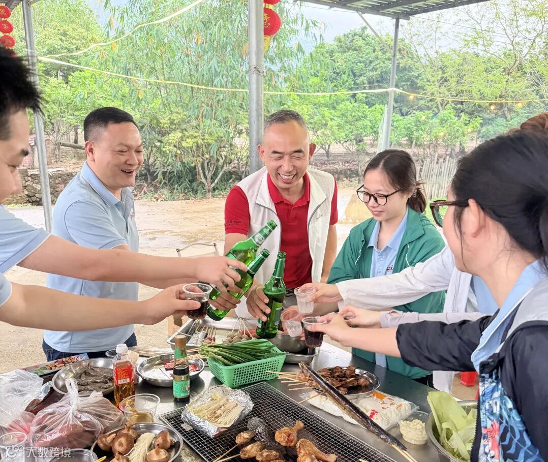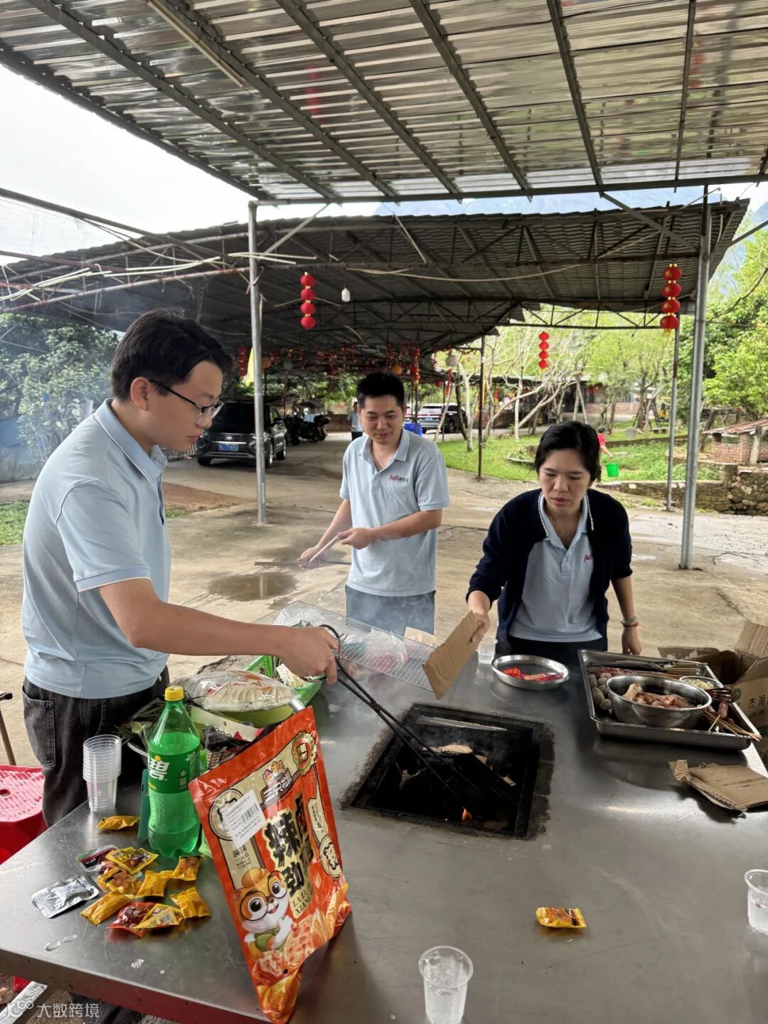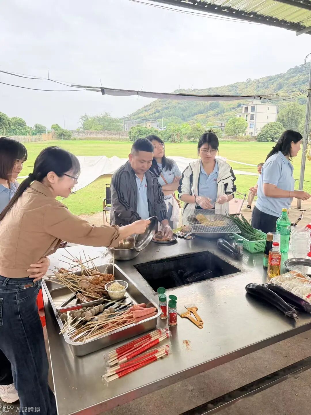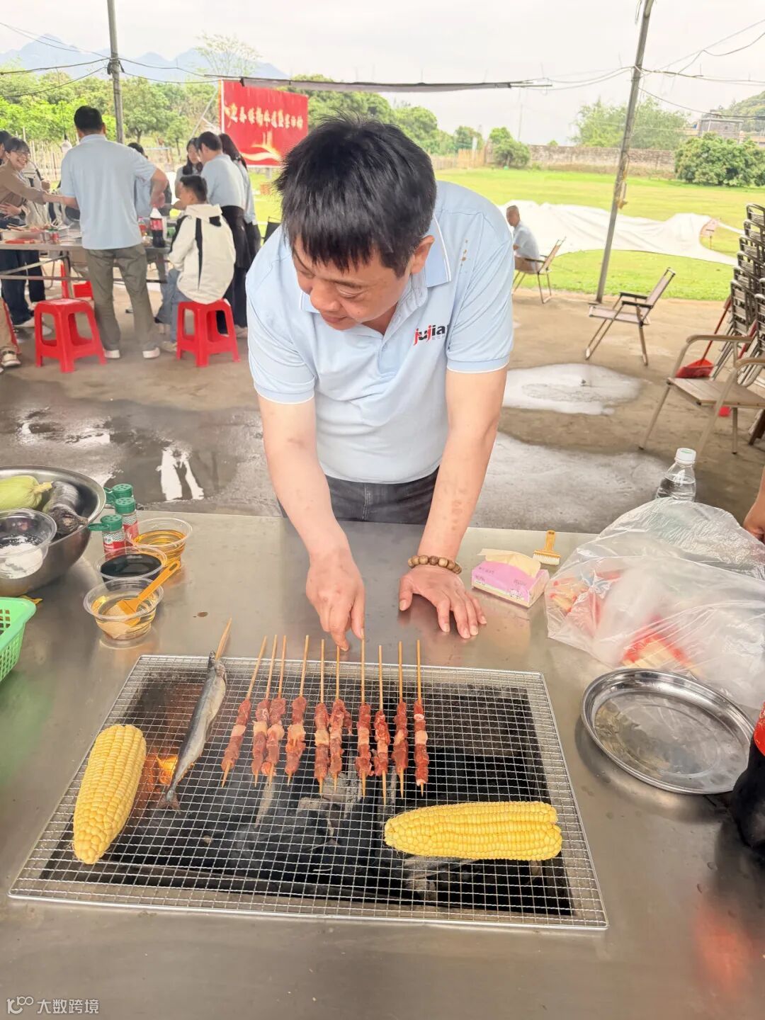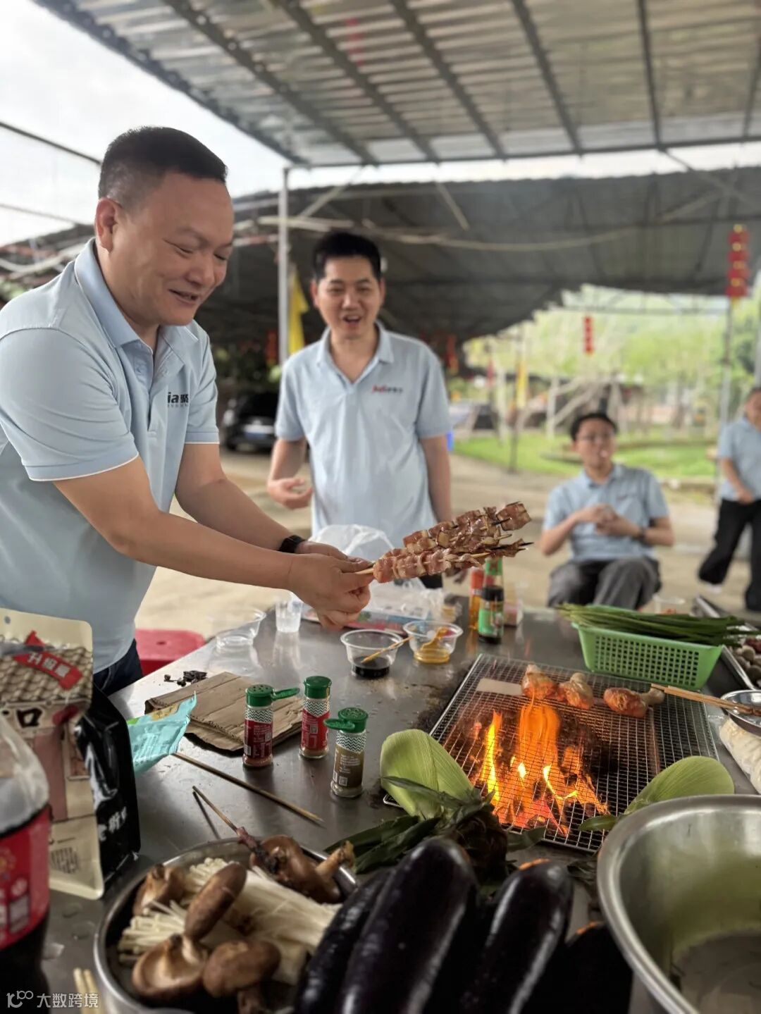 大家分工明确、各司其职,化身“烧烤达人”:有人负责生火烤肉,熟练地翻转着串儿,刷上秘制酱料,焦香四溢的香气瞬间弥漫全场;有人负责串制食材,有条不紊地搭配荤素,让每一串都分量十足、口感绝佳;还有人围坐在炭火旁,一边等待美食,一边畅谈生活与工作,分享日常趣事,偶尔调侃打趣,欢声笑语回荡在夜空。