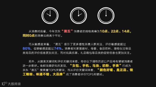 另外,从搜索关键词和评价关键词来看,符合以下调性的进口产品将有望被消费者进一步看好。南都消费研究所发现,“女包、手机、马油、奶粉、手表”已成为京东”黑五”搜索量TOP5关键词,而从评价关键词来看,“颜色好看、是正品、做工精细、味道不错、大品牌”成了消费者评价TOP5关键词。