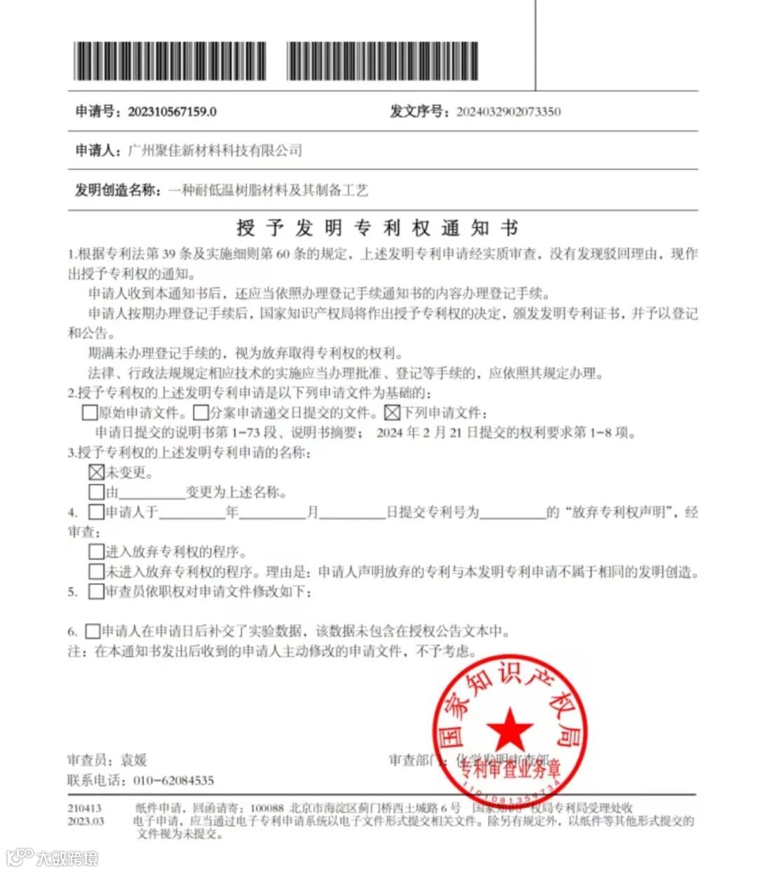 近日,广州聚佳新材料科技有限公司申报的“一种防腐耐酸丙烯酸树脂胶黏剂及其制备方法”、“无溶剂丙烯酸树脂及其制备方法、应用”、“一种耐低温树脂材料及其制备工艺”三项发明专利顺利通过国家知识产权局审查认证,并被授予《发明专利证书》。该三项专利发明的获得体现了广州聚佳具备自主创新研发的能力,同时也标志着广州聚佳在丙烯酸树脂行业技术创新领域更进一步。