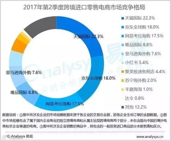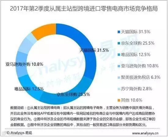在这份《2017年Q2中国跨境进口零售电商市场季度监测报告》中,还有一份值得深思的数据。在从属主站型的跨境进口零售电商市场份额布局中,前三位分别是,天猫国际、京东全球购、唯品国际,市场份额分别为31.5%、25.5%、12.5%。