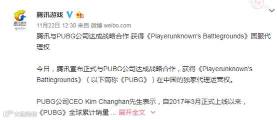 22日午间,腾讯通过腾讯游戏微博、腾讯微信公众号等多个官方渠道宣布:腾讯与 PUBG 公司达成战略合作获得《Playerunknown’sBattlegrounds》(《绝地求生》,以下简称《PUBG》)国服代理权。