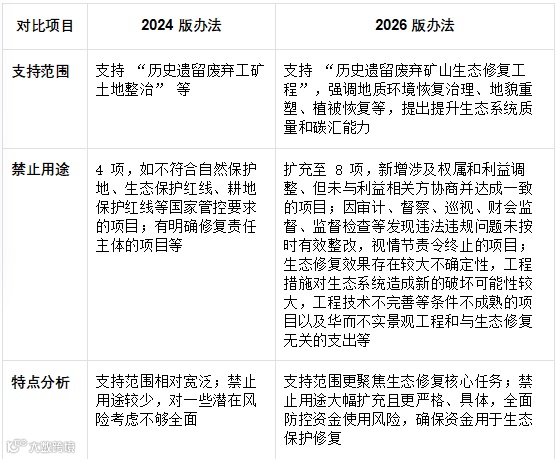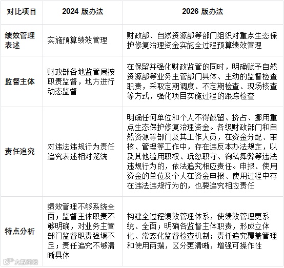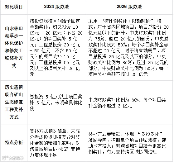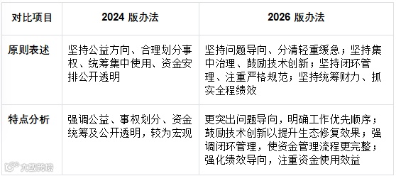 其中,2024 年 2 月 1 日财政部以 “财资环〔2024〕6 号” 文件印发的《重点生态保护修复治理资金管理办法》(下称 “2024 版办法”),为前期生态保护修复资金管理提供了基础框架;2026 年 1 月,财政部再次修订发布新版《重点生态保护修复治理资金管理办法》(下称 “2026 版办法”),在 2024 版办法基础上,针对资金使用原则、分配方式、项目管理及绩效监督等多方面进行优化调整,进一步适配 “十五五” 时期生态保护修复工作需求,旨在更精准高效地引导资金投向,提升生态保护修复成效。本文将深入对比 2024 版与 2026 版管理办法的差异内容,讲解资金申请办法的要领,为相关单位准确理解政策要求、规范开展资金申报工作提供系统性指导,助力生态保护修复资金发挥最大效益。