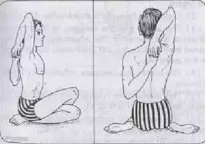 2. 右手臂弯曲放在头后方,左手握住右手肘,将右手臂往右方、下方、右下方伸展。