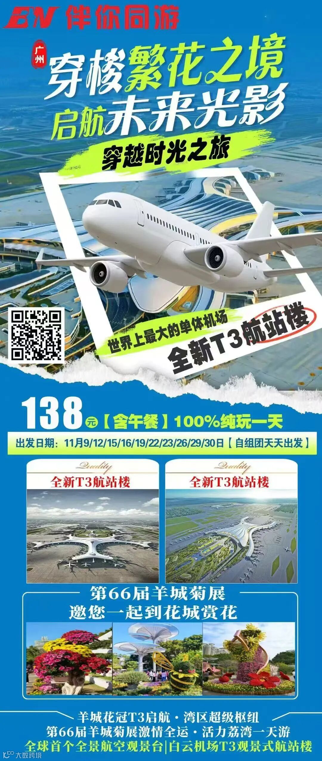 上午:于指定地点出发,乘车前往广州游览【广州白云机场T3航站楼】(白云机场观景台看飞机航线起飞,根据机场官方开放政策为准,如遇到暂未开放或者当日时间段观景台预约人数已满,则自动取消观景台景点,旅行社不作任何赔偿处理)T3航站楼是广州白云国际机场三期扩建工程的主体工程,从空中俯瞰,犹如“羊城花冠”。T3航站楼内外花团锦簇,从天花到地板随处可见花的元素,体现了广州花城的特色。整个航站楼内的设计,一改常规的工业风冷色调,而是以暖色调为主基调。如果从空中俯瞰,整个航站楼白色金属屋面也像花瓣,这些金属屋面的面积大约31.19万平方米,相当于45个标准足球场的大小。作为国内机场第一个可以近距离观赏机场大全景的航空瞭望打卡地标,旅客可以在乘机间隙来这里近距离观赏。此外,这个观景平台设立在机场公共区域过安检之前的范围,市民即使不搭乘飞机,也可以到此一游,拍照打卡。