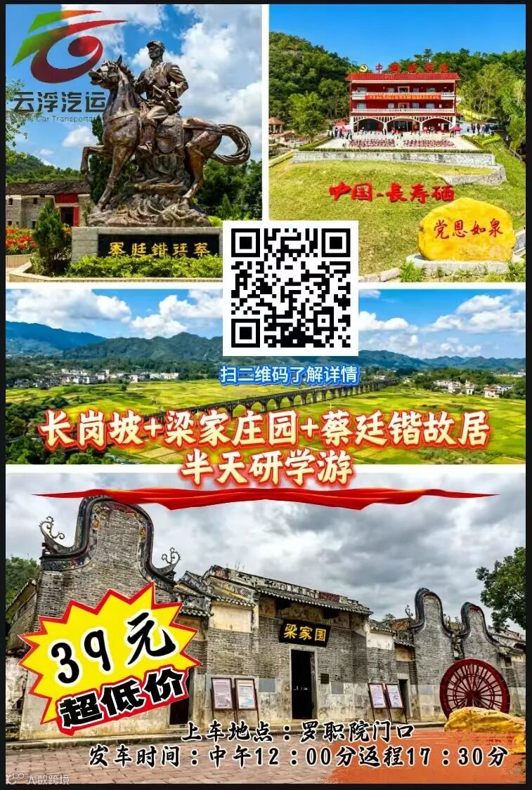 梁家庄园、长岗坡、蔡廷锴故居特价研学游,11月1日起逢周六成团出发,一起来领略罗定文化吧! 云浮市汽车运输集团有限公司