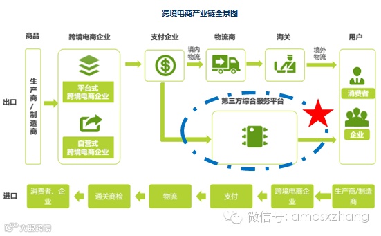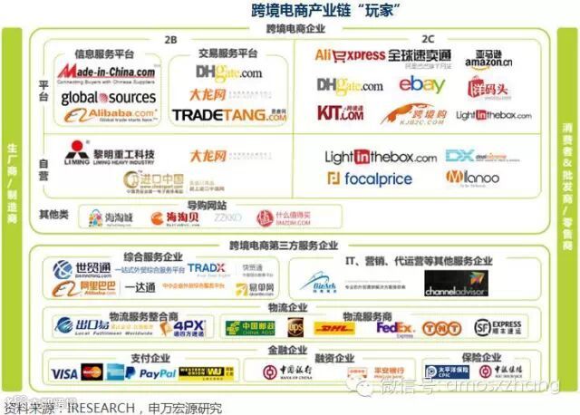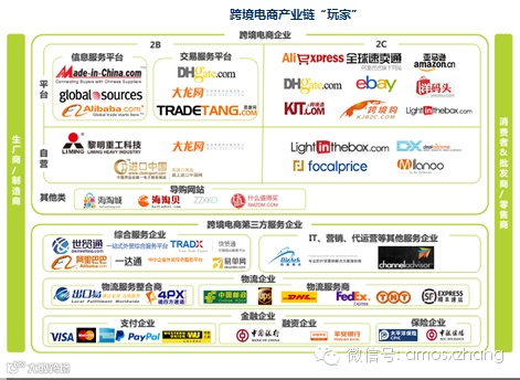 跨境电商产业链主要有三类玩家:生产商/制造商、跨境电商企业(含配套服务企业)、消费者/批发商/零售商(用户)