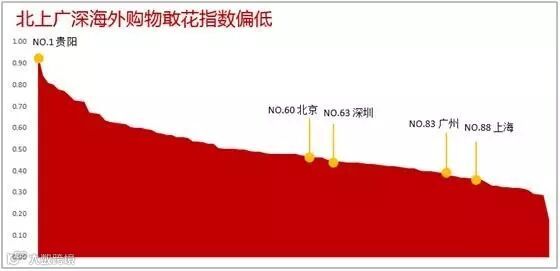 西南三省省会贵阳、南宁和昆明包揽前三,当选全国最具超前消费意识、最敢花城市。年人均海外购物消费金额均超过1.2万,在100城人均消费金额排名中位列前五。