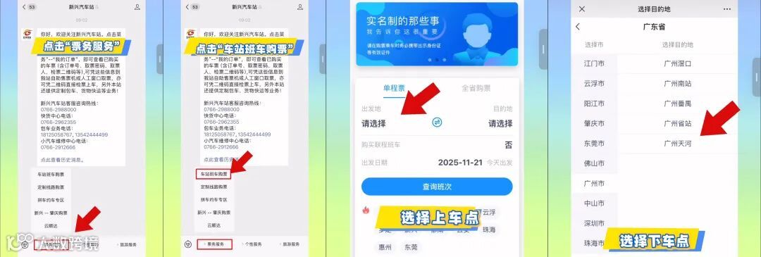 关注“新兴汽车站”公众号,点击票务服务-车站班车购票-,选择线路、日期、上下车站点,添加乘客,提交订单即可。