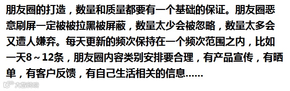 大咖微商:每天固定规律刷圈,朋友圈文案精挑细选,每条朋友圈必有所指,产品、活动、晒单晒支付晒发货晒买家秀晒生活晒逼格,不同类型的内容搭配得当。