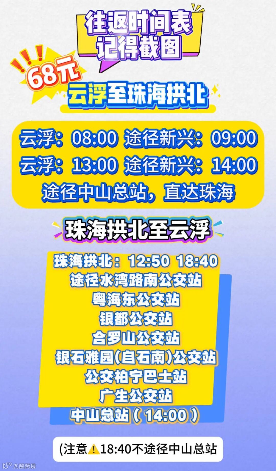 【云浮⇄珠海¥68元】5月26日起,不限班次,不限量,超值出行不容错过!