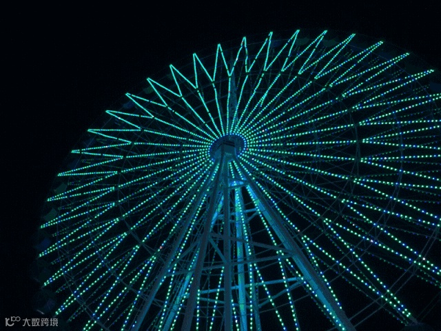 多彩绚丽夜间灯光秀的摩天轮。
