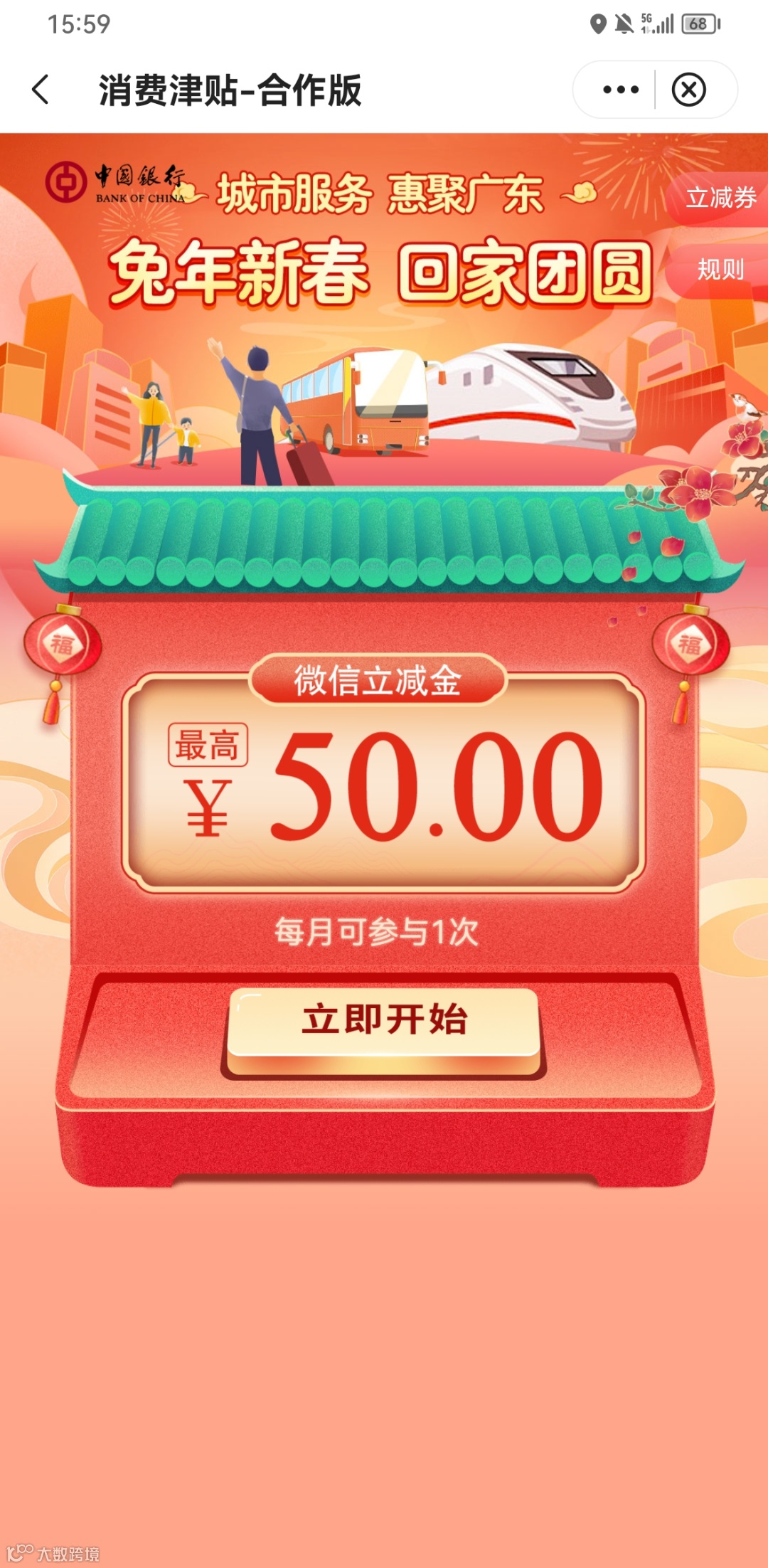 前往以上合作平台微信公众号,在菜单栏位置找到中行活动入口,点击跳转中国银行APP即可参与活动,随机抽取最高50元微信立减金(使用微信支付时可抵扣使用)。每位客户每月均可参与一次,每日名额有限,先到先得。