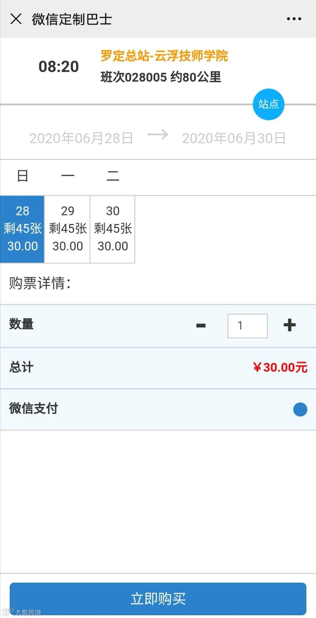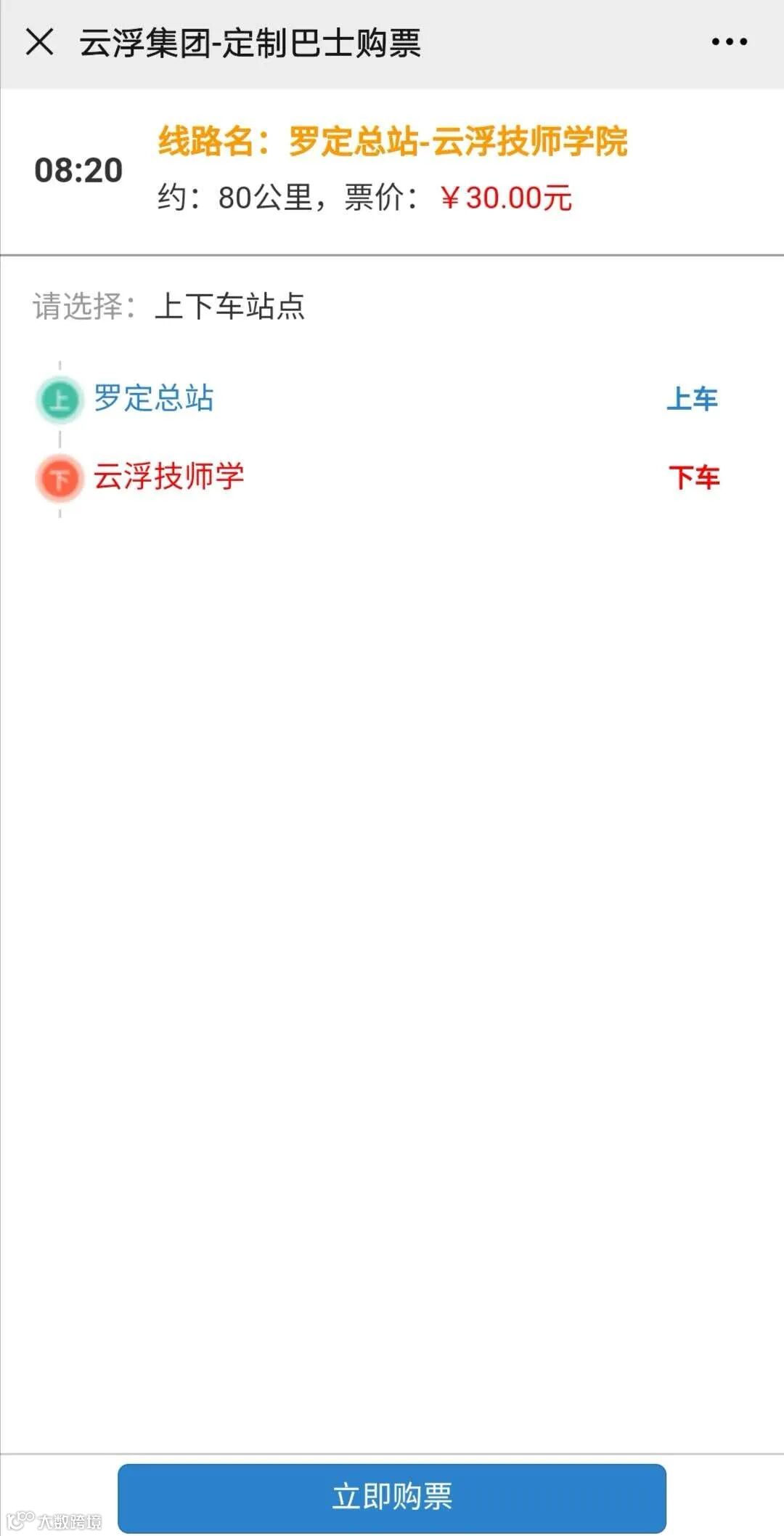 4、选择需要乘坐的站点,点击【立即购票】
