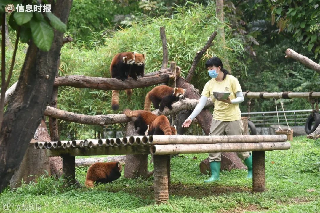 在小熊猫区,小熊猫们格外配合饲养员的安排,向游客展示“吃喝卖萌”的绝技。