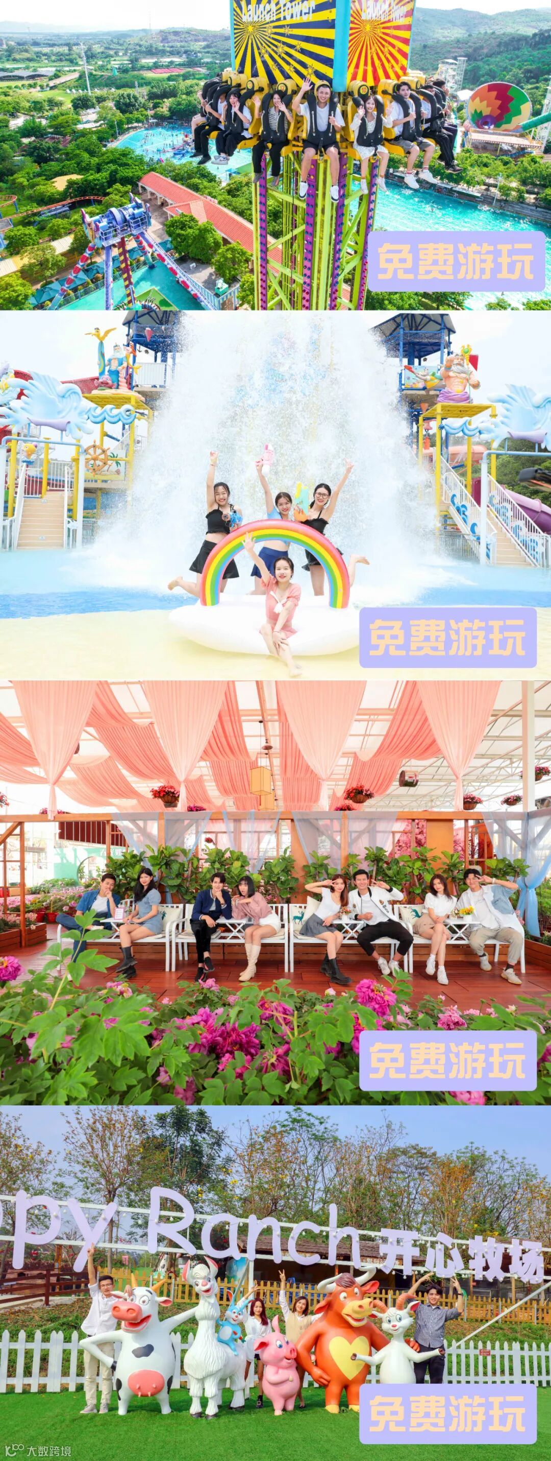 缤纷花海、开心牧场、牛牛剧场、网红抖乐园
