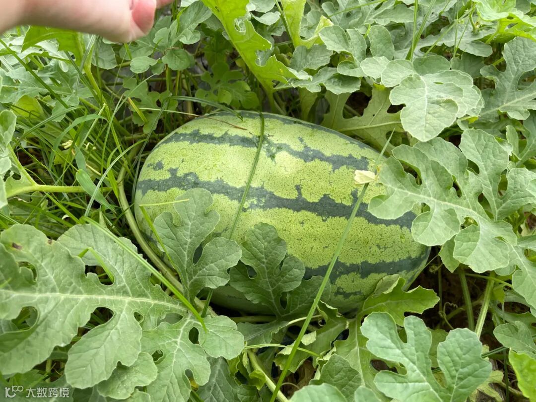 ▲拨开瓜藤,看到藏于其中的大西瓜,深褐色和浅色相互交错,相映成趣。