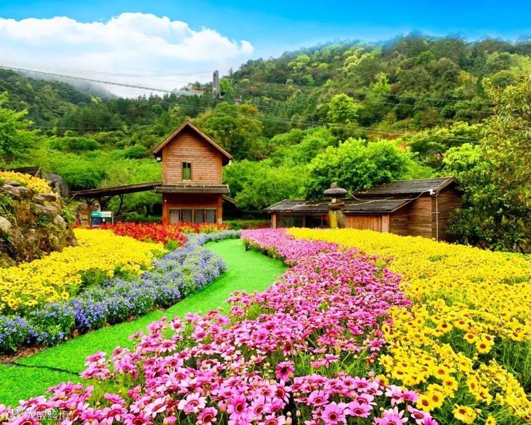 在梅溪古镇前,一片姹紫嫣红的花谷在周边山峦起伏的衬托下,显得满眼苍翠鲜花形成的美丽色带成为一道别样的风景。