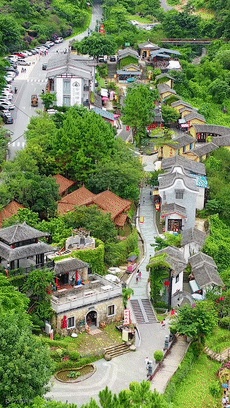 在梅溪古镇前,一片姹紫嫣红的花谷在周边山峦起伏的衬托下,显得满眼苍翠鲜花形成的美丽色带成为一道别样的风景。