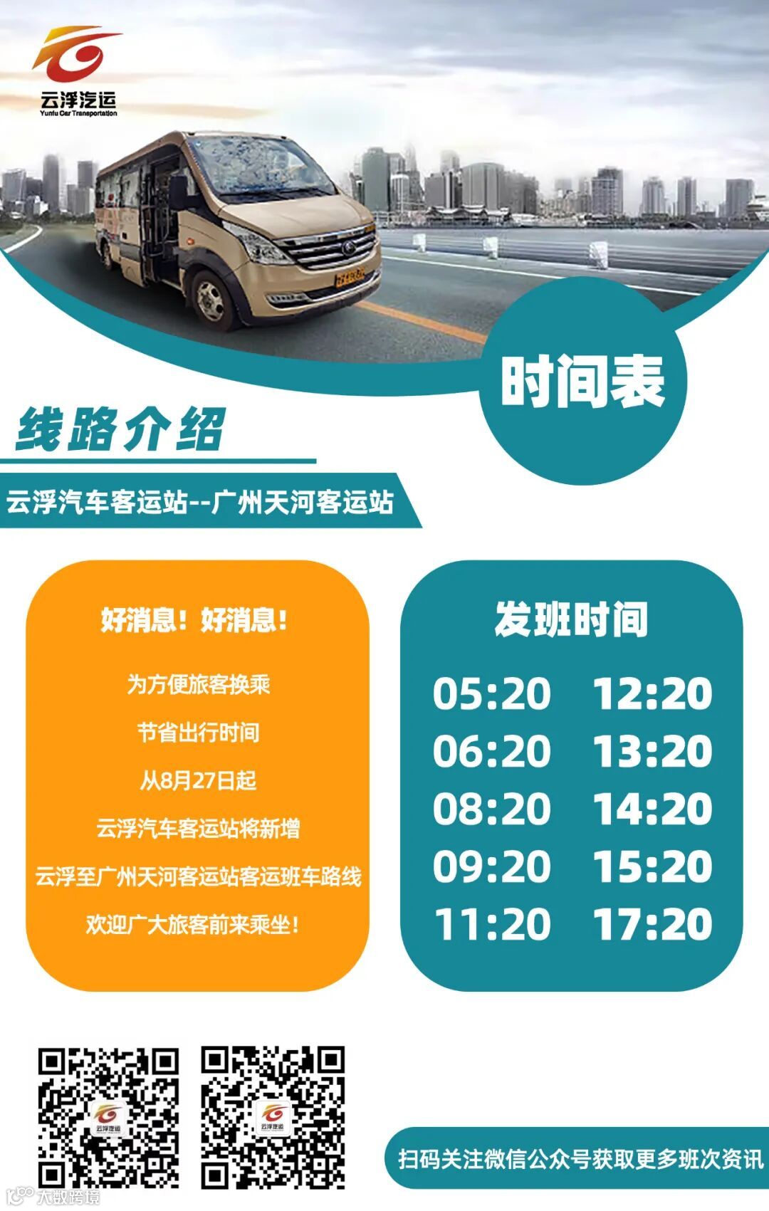 为方便旅客换乘,节省出行时间,从8月27日起,云浮汽车客运站将新增云浮至广州天河客运站客运班车路线,欢迎广大旅客前来乘坐!