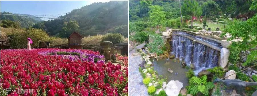 在梅溪古镇前,一片姹紫嫣红的花谷在周边山峦起伏的衬托下,显得满眼苍翠鲜花形成的美丽色带成为一道别样的风景。