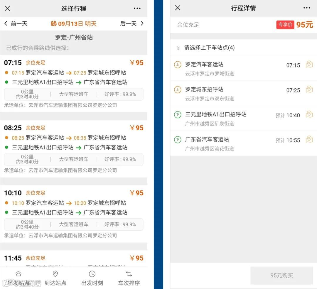 三元里地铁A1出口招呼站--罗定汽车总站:08:30、09:50、11:15、12:55、14:55、15:55、18:50、20:20