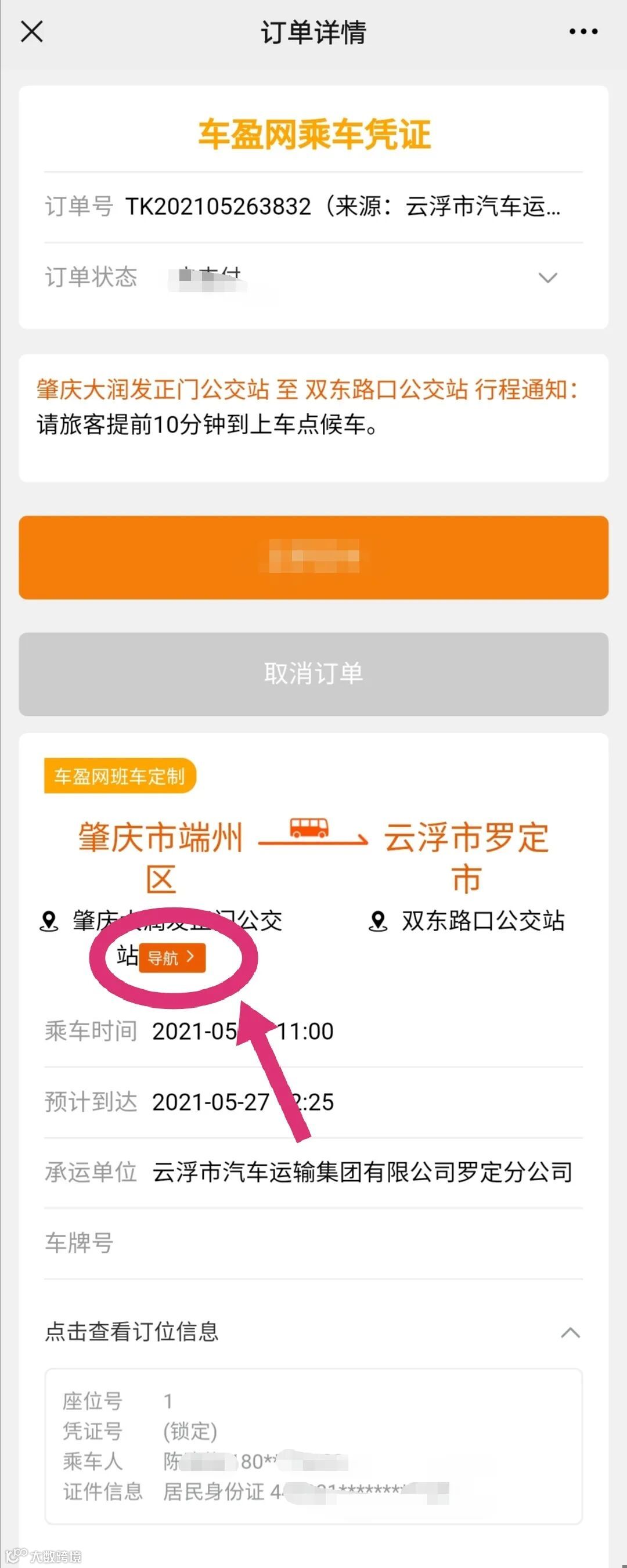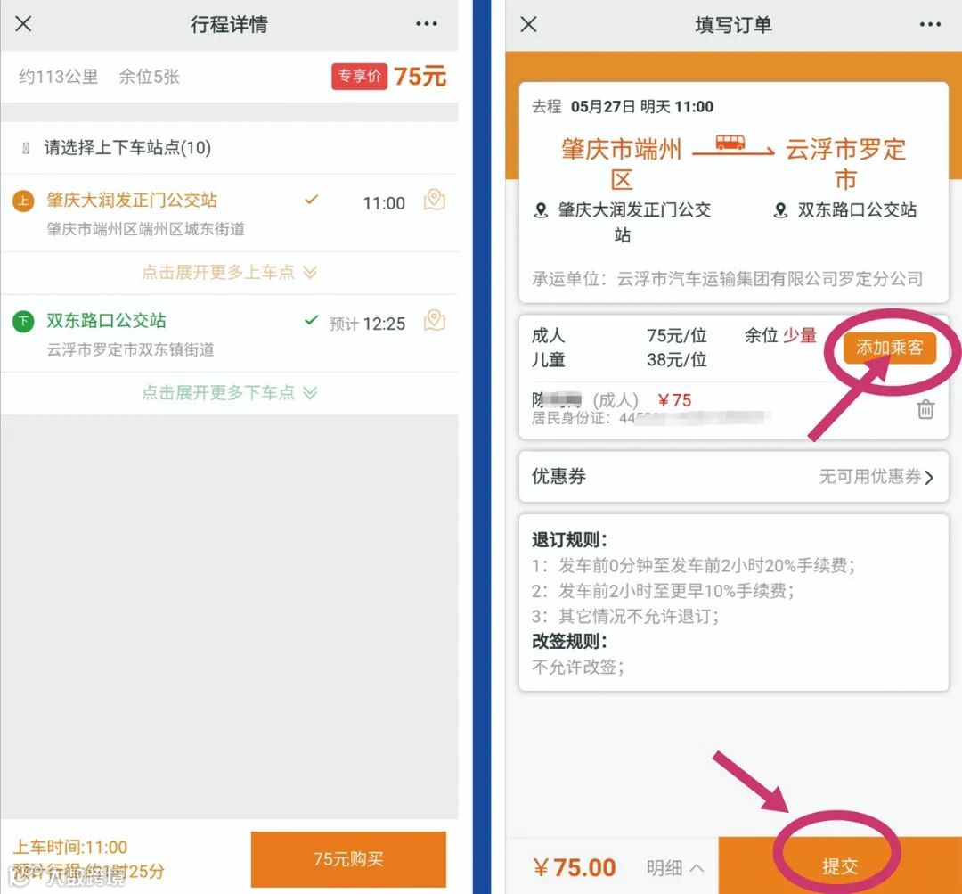 3、确认了时间和上、下车点后点击“购买”—“添加乘客”—“提交”—“订单支付”即可完成购票。