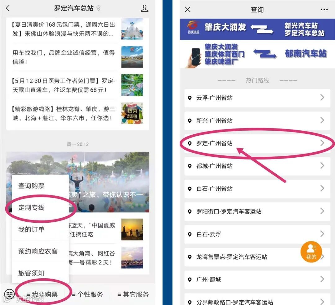 1、公众号下方菜单栏“我要购票”—“定制专线”—选择所需的出行线路;