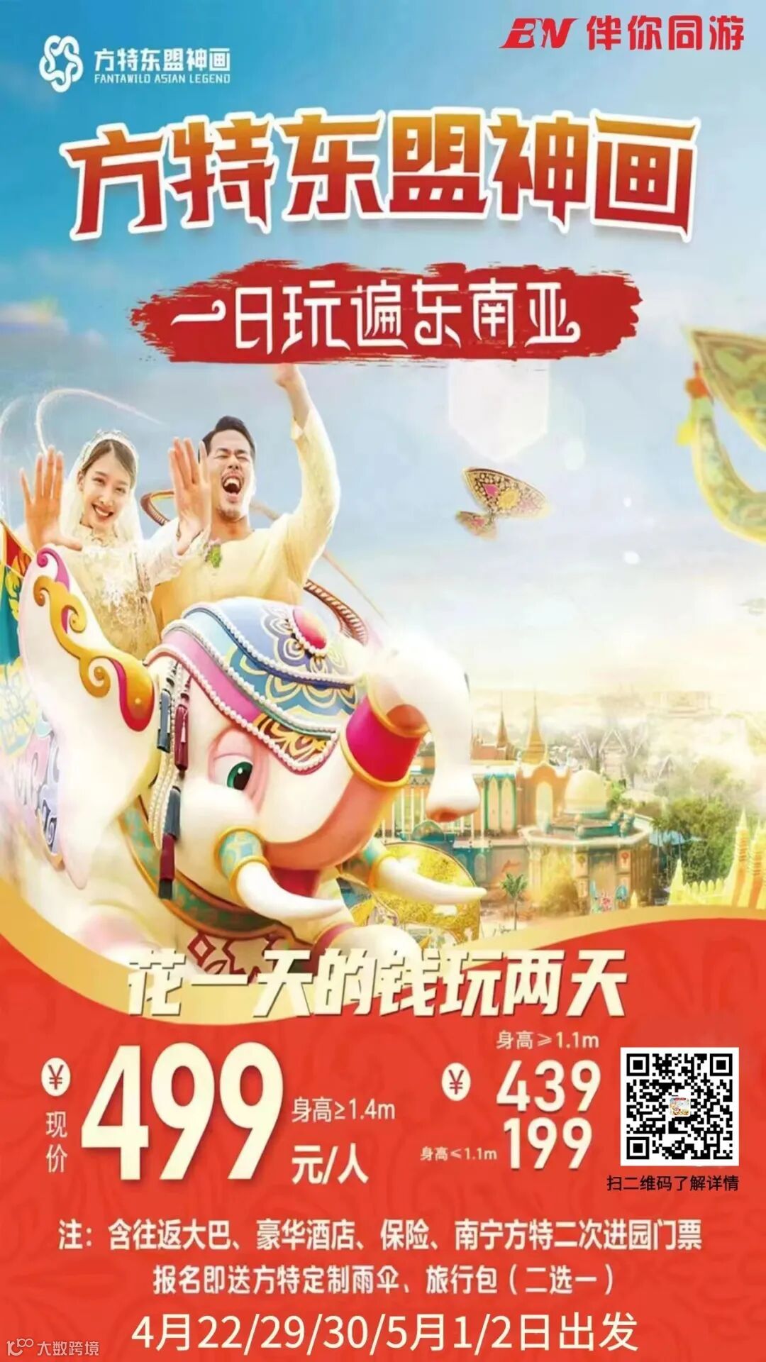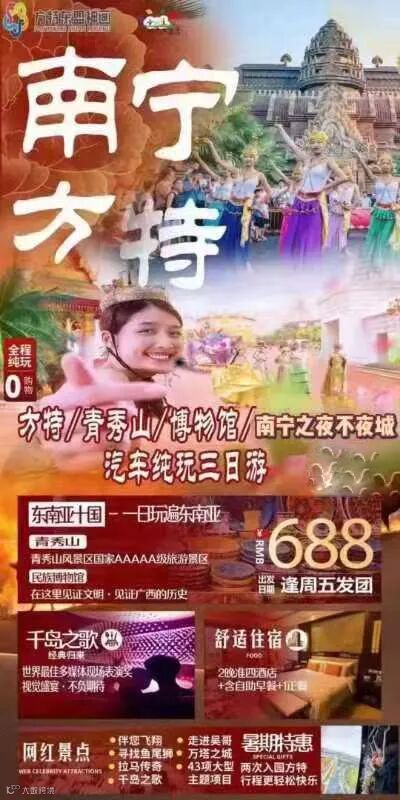 早上于指定时间地点集合前往南宁(车程约4小时)抵达南宁后直接前往【方特东盟神画】南宁方特东盟神画主要以巨型球幕影院、幻影成像剧场、立体式跟踪电影、室内轨道电车、木质过山车、荷兰威克玛过山车等高科技设施组成,主要项目有塔銮盛典、魅力越南、走进吴哥、拉玛传奇、动感狮城、马六甲风云、万塔之城、千岛之国、七彩文莱、菲国之韵、东南亚飞翔之旅11个高科技室内项目及33项大型游乐设备。乐园将以一种全新的文化娱乐形式展现东盟十国自然风光、历史文化和民俗风情。