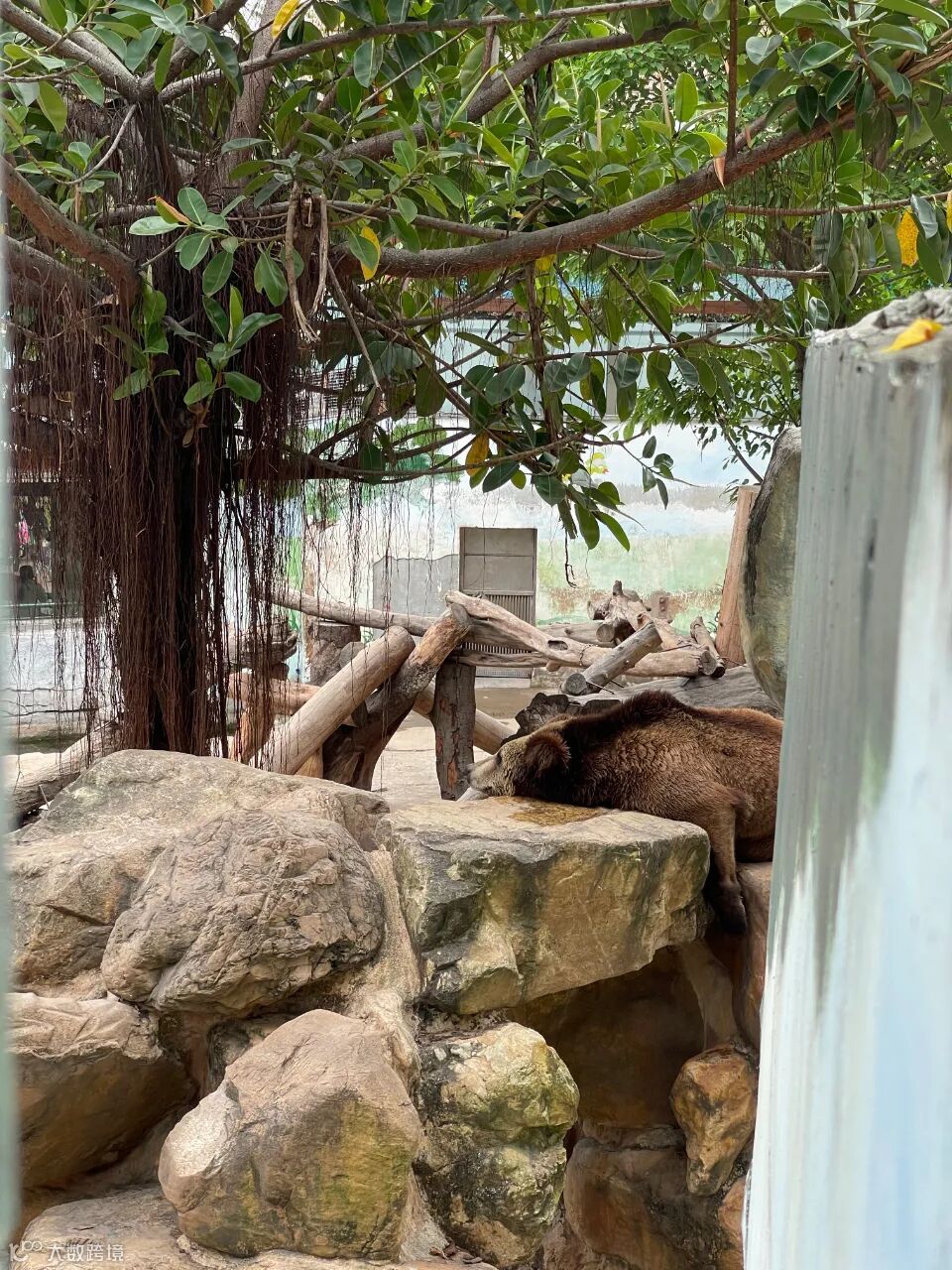 不过,也有例外。在猴山,猕猴们就各行其是,或戏水或游荡或晒太阳,一副见惯不怪的神态;在熊区,一只马来熊自顾自躺在木头架子上,神态慵懒,对游客爱理不理;在虎区,一对华南虎躺在笼子里双眼微闭,一副世界独醒我独睡的模样。