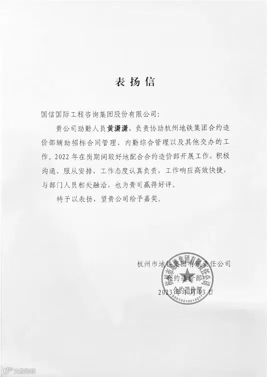 这其中,还有来自杭州地铁运营有限公司的表扬信,表扬国信国际工程咨询集团股份有限公司驻场人员在2022年度招标代理项目以及其他交办的工作中,遵守项目单位的规章制度,项目上积极沟通、服从安排,工作态度认真负责,工作响应高效快捷,国信人将二十三年的优良工作传统,带到了每一个项目中。
