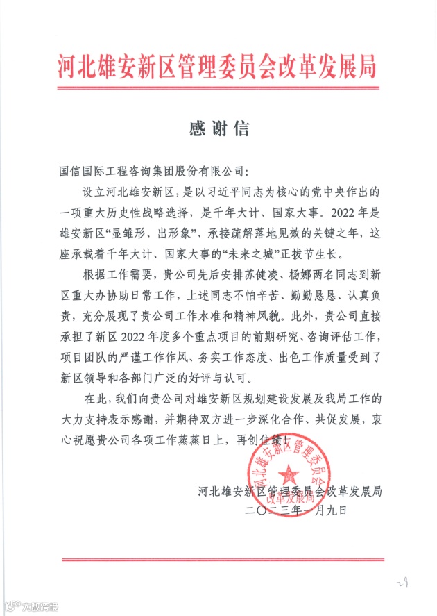 这其中,有来自河北雄安新区管理委员会改革发展局的感谢信,信中表示2022年是雄安新区显雏形、出形象,承接疏解落地见效的关键之年,国信国际工程咨询集团股份有限公司承担了新区多个重点项目的前期研究、咨询评估,项目团队的严谨工作作风、务实工作态度、出色工作质量,受到新区领导和各部门的广泛好评和表扬,对驻场人员不怕辛苦、勤勤恳恳、认真负责的工作精神给与了充分肯定,同时还表达了希望深化合作、共促发展的美好愿望。