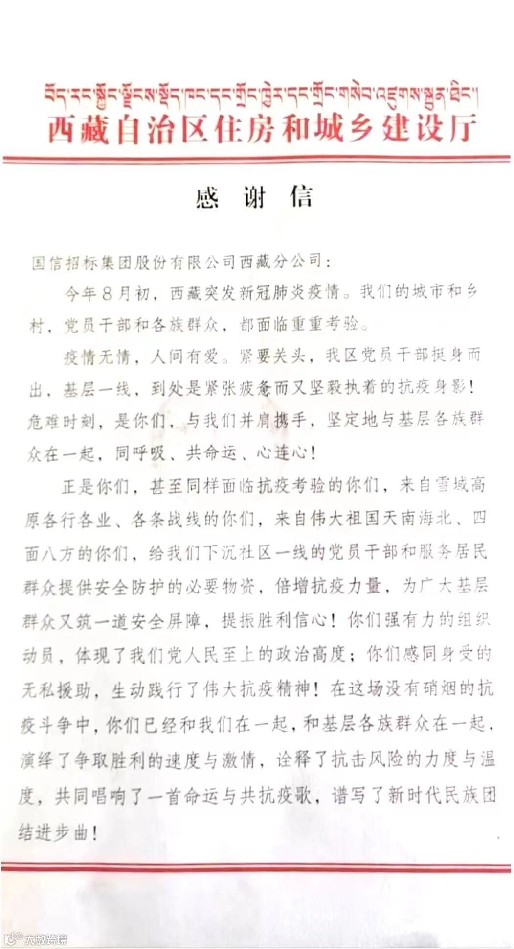 这其中,还有来自西藏自治区住房和城乡建设厅发来的感谢信,对国信招标集团股份有限公司西藏分公司进行感谢,表达了疫情无情,人间有爱,紧要关头,无私奉献,为下沉一线的党员干部和服务居民群众送去必要物资,与广大基层群众一起并肩携手,共筑安全屏障。除了西藏,还有新疆、内蒙古、吉林、云南、上海、北京......国信人同心战役、众志成城,将温暖和担当送到祖国的大江南北,这是一份爱心,也是一份社会责任。