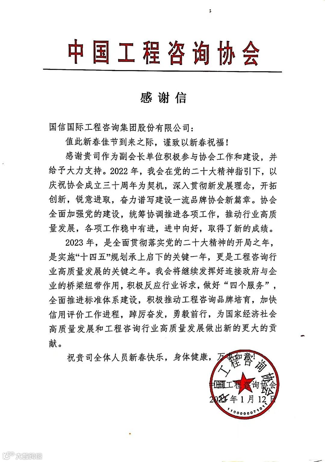 这其中,有中国工程咨询协会发来的感谢信,感谢国信国际工程咨询集团股份有限公司作为副会长单位积极参与咨询协会的工作与建设,并给予大力支持。2022年是中国工程咨询协会成立三十周年,三十年来,协会坚持高点站位,服务国家重大战略,为国家和地方经济的高质量发展注入强劲动能,在国家重大战略决策、重大和基础性产业发展、重大工程建设等方面发挥了重要作用。国信集团作为咨询行业标杆企业,一直致力于助推工程咨询行业发展建设,2022年,集团承接和参与了多项重大课题研究工作,为推动咨询行业的蓬勃发展献策献言,发挥了“智库”和“参谋”作用。这是国信人对自己的要求,也是国信人对咨询行业明天的希冀。