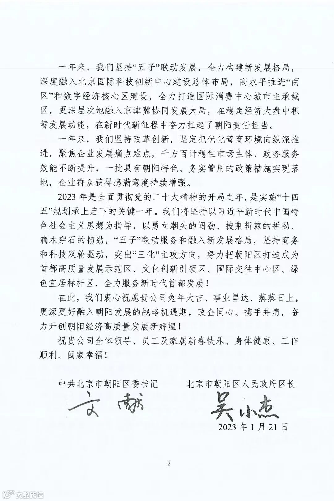 这其中,还有来自中国共产党北京市朝阳区委员会和朝阳区人民政府的感谢信,国信国际工程咨询集团股份有限公司作为驻区企业,以服务为中心,始终立足于区经济建设的最前沿,连续多年获得朝阳区的表扬,此次朝阳区人民政府以统发形式,感谢驻区企业长期以来对朝阳区经济社会发展的关心、支持和帮助同样是一种激励,我们将在新的一年更深更好融入朝阳发展的战咯机遇期,政企同心、携手并肩,奋力开创朝阳经济高质量发展新辉煌。